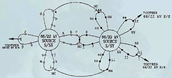 新加坡整個電網分為400、230、66千伏輸電網絡和22、6.6千伏及400/230伏配電網絡。22千伏配網接線方式考慮N-1原則,采用以變電站為中心的花瓣形接線,即同一個雙電源變壓器并聯(lián)運行的變電站(66/22千伏)的每兩回饋線構成環(huán)網,閉環(huán)運行,不同電源變電站的花瓣間設置聯(lián)絡開關,處于常開狀態(tài)。22千伏配電線路均裝設縱差保護,至客戶或變壓器的支路采用過流和接地保護。環(huán)網最大負荷電流不超過400安培,環(huán)網的設計容量為15兆伏安,饋線按照50%負荷設計,且全部實現電纜化、全戶內配電裝置。花瓣式接線如圖1所示。