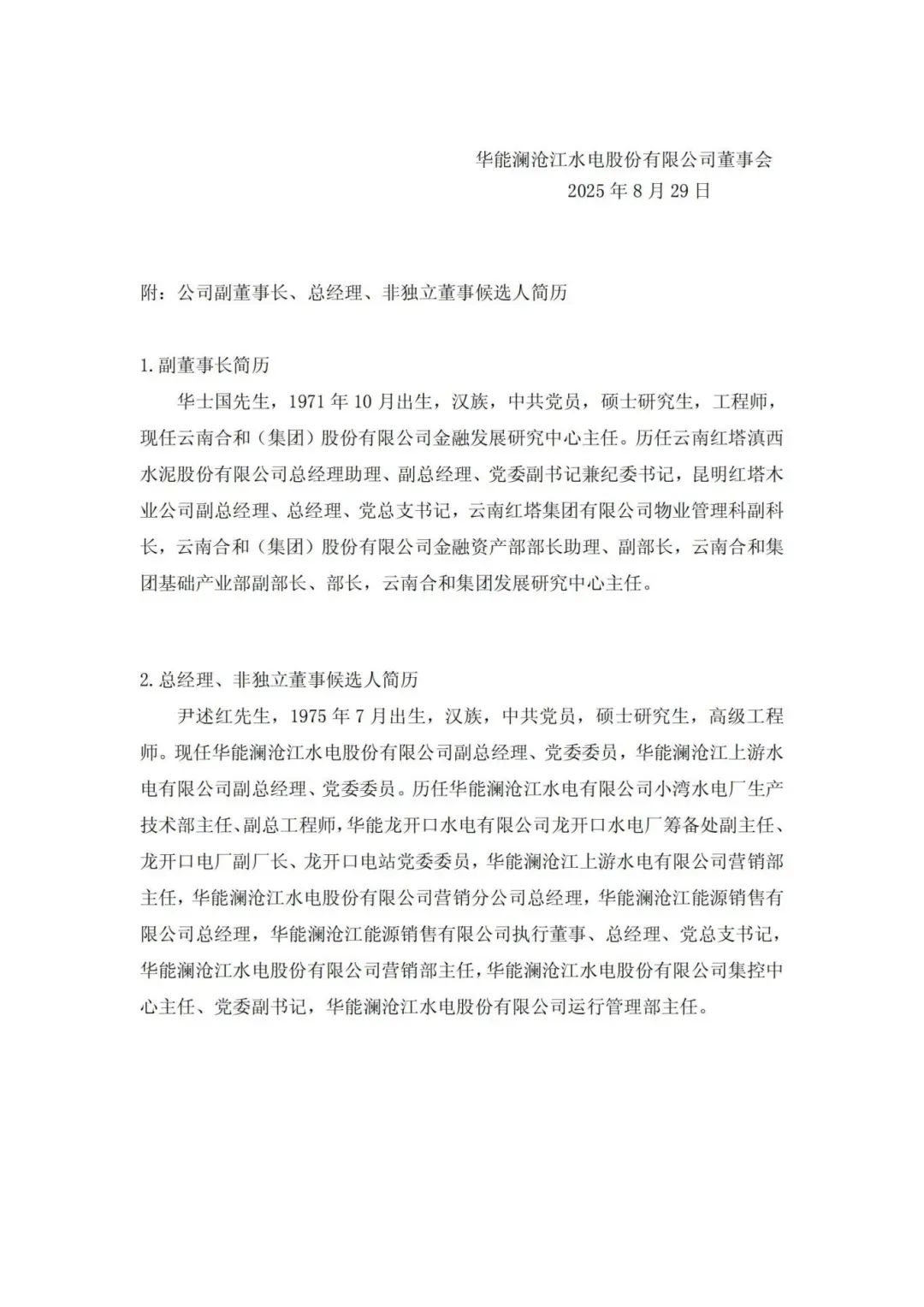 8月28日,華能瀾滄江水電股份有限公司(以下簡稱“華能水電”)公告稱,華能水電于8月28日召開第四屆董事會第十次會議,審議通過了《關(guān)于選舉公司副董事長的議案》《關(guān)于聘任公司高級管理人員的議案》《關(guān)于選舉公司非獨立董事候選人的議案》。