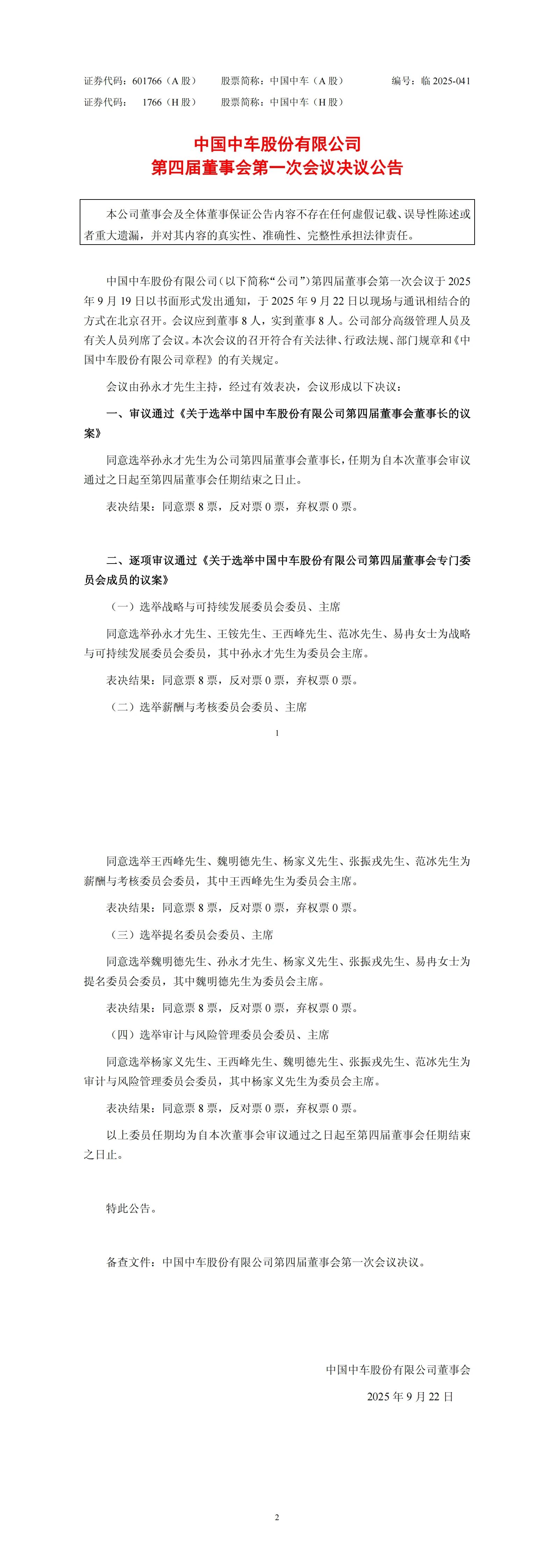 9月22日,中國(guó)中車股份有限公司第四屆董事會(huì)第一次會(huì)議在北京召開,審議通過(guò)董事長(zhǎng)選舉議案,同意孫永才當(dāng)選公司第四屆董事會(huì)董事長(zhǎng),任期自本次會(huì)議審議通過(guò)之日起至第四屆董事會(huì)任期結(jié)束。