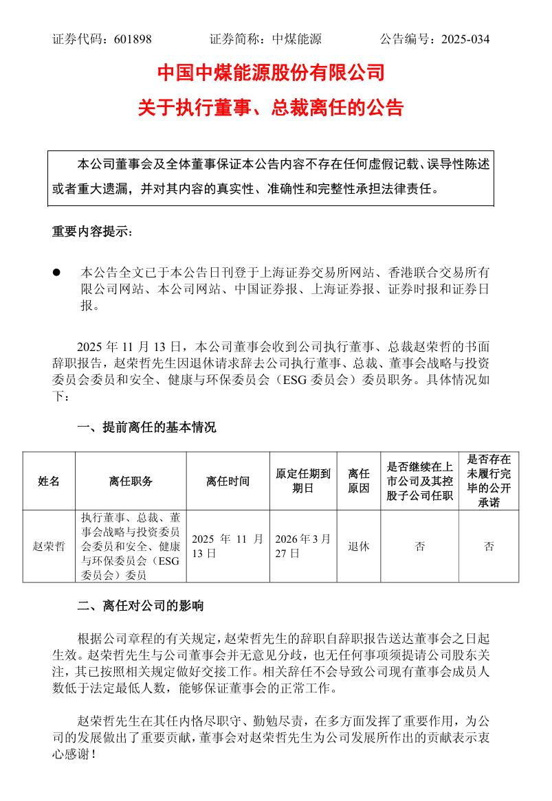 11月14日,中煤能源發(fā)布公告稱,11月13日,公司董事會收到公司執(zhí)行董事、總裁趙榮哲的書面辭職報告,趙榮哲先生因退休請求辭去公司執(zhí)行董事、總裁、董事會戰(zhàn)略與投資委員會委員和安全、健康與環(huán)保委員會(ESG委員會)委員職務。