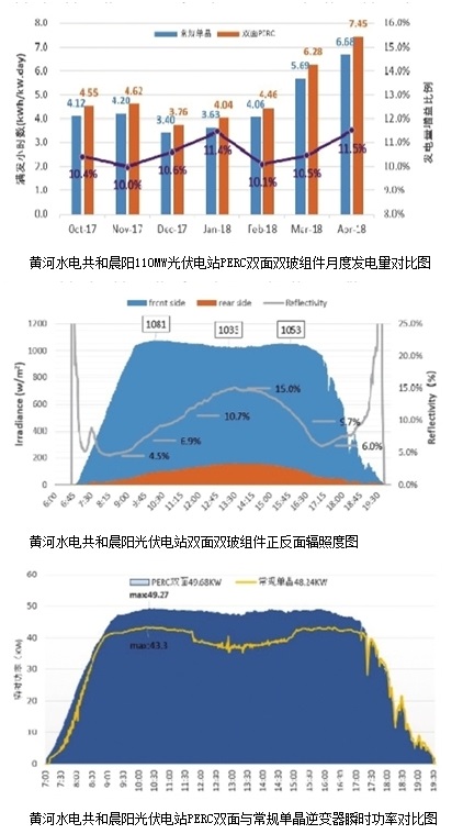 2018年4月,國際權威檢測機構TüV萊茵通過對全球首個大規模應用PERC雙面雙玻組件的黃河水電共和晨陽光伏電站的現場測試,并對該電站自并網以來長達185天的發電量數據進行統計分析,最終得出結論:采用相同平單軸跟蹤技術的5.5MW晶澳PERC雙面雙玻組件方陣比相同規模的常規單晶組件方陣單位千瓦的發電量高出10.5%。 按1元/千瓦時的上網電價計算,5.5MW的雙面雙玻組件可為客戶帶來80萬元的年收入增益;以電站造價6元/瓦進行計算,能夠節省項目投資300萬元,度電成本下降高達10%。