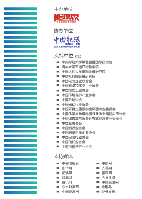 包容、開放、合作是“能金會”一貫主張,各路專家學(xué)者、行業(yè)大咖共聚一堂,為能源金融發(fā)展獻(xiàn)策獻(xiàn)力,實(shí)現(xiàn)行業(yè)的共享、共贏是大會不變的中心思想。據(jù)了解,第二屆“能金會”擬邀請國家級行業(yè)協(xié)會、重點(diǎn)科研院所、大型咨詢公司、銀行及各分行、融資租賃、保險(xiǎn)信托、基金、證券、保理、資本、風(fēng)投、金控等金融機(jī)構(gòu)和央企及央企子公司、省市級地方國企、水電、儲能、太陽能、風(fēng)能、氫能、生物質(zhì)能、新能源汽車、節(jié)能、環(huán)保、分布式、創(chuàng)新技術(shù)、冷熱電聯(lián)產(chǎn)、綜合能源服務(wù)、能源EPC設(shè)計(jì)商、承建商等政府機(jī)構(gòu)、科研單位、能源企業(yè)和國內(nèi)權(quán)威媒體、行業(yè)媒體參會,會議規(guī)模預(yù)計(jì)將達(dá)700人。
