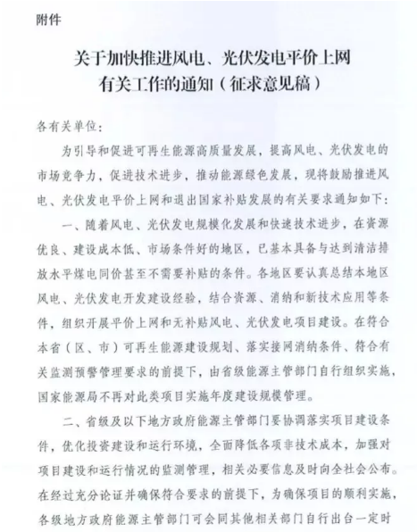 據獲悉,近日,國家能源局印發了《關于加快推進風電、光伏發電平價上網有關工作的通知(征求意見稿)》,通知指出,隨著風電、光伏發電規?;l展和快速技術進步,在資源優良、建設成本低、市場條件好的地區,已基本具備與達到清潔排放水平煤電同價甚至不需要補貼的條件。