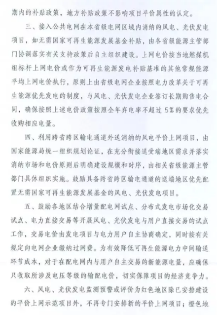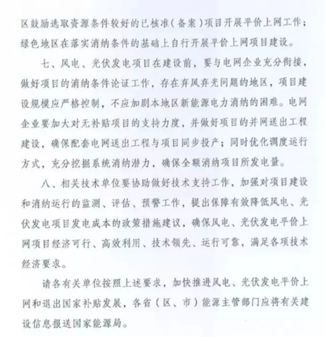 此外,風電、光伏發電監測預警或評價為紅色地區除已安排建設的平價上網示范項目外,不再專門安排新的平價上網項目;橙色地區鼓勵選取資源條件較好的已核準(備案)項目開展平價上網工作;綠色地區在落實消納條件的基礎上自行開展平價上網項目建設。