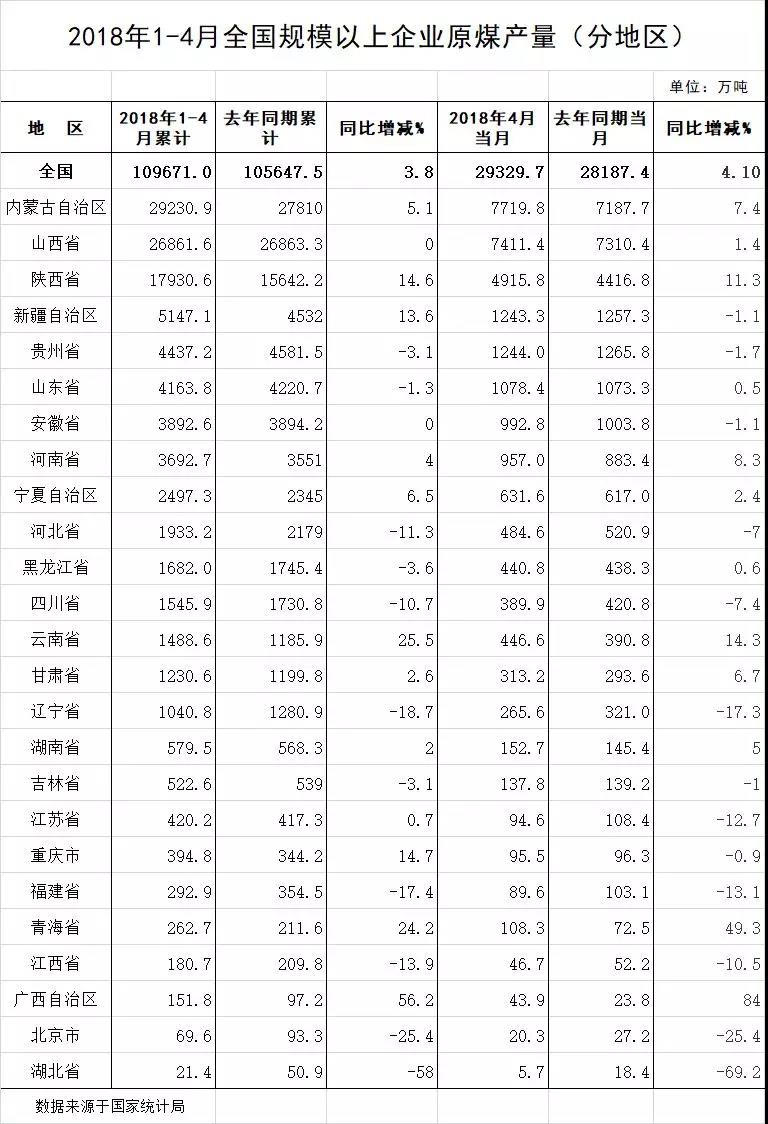 1-4月全國規模以上企業原煤產量 (分地區)