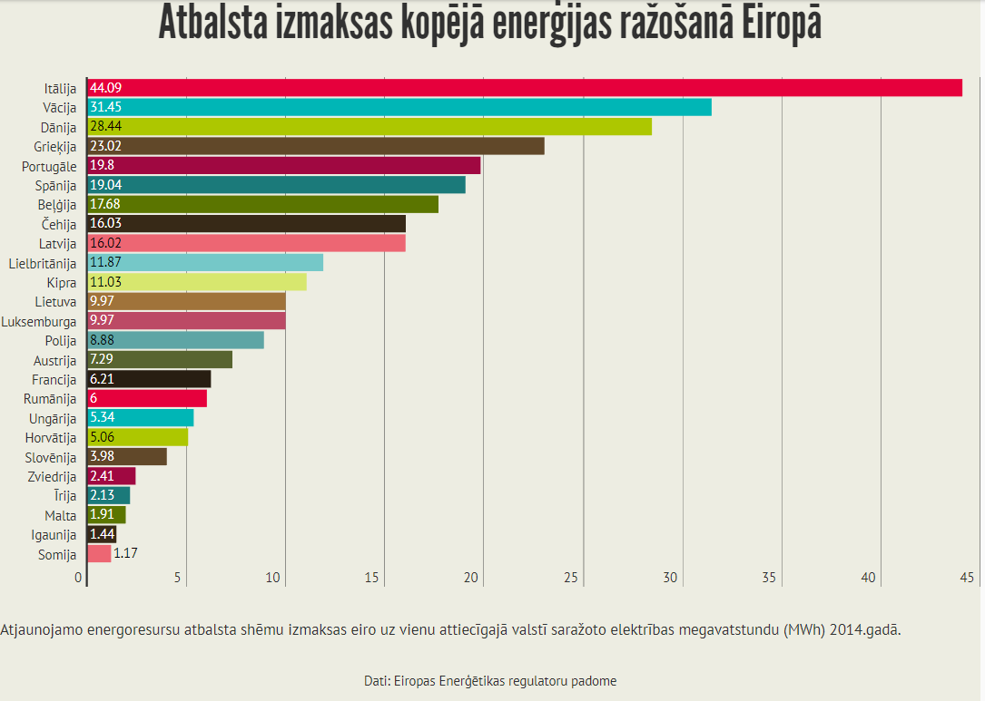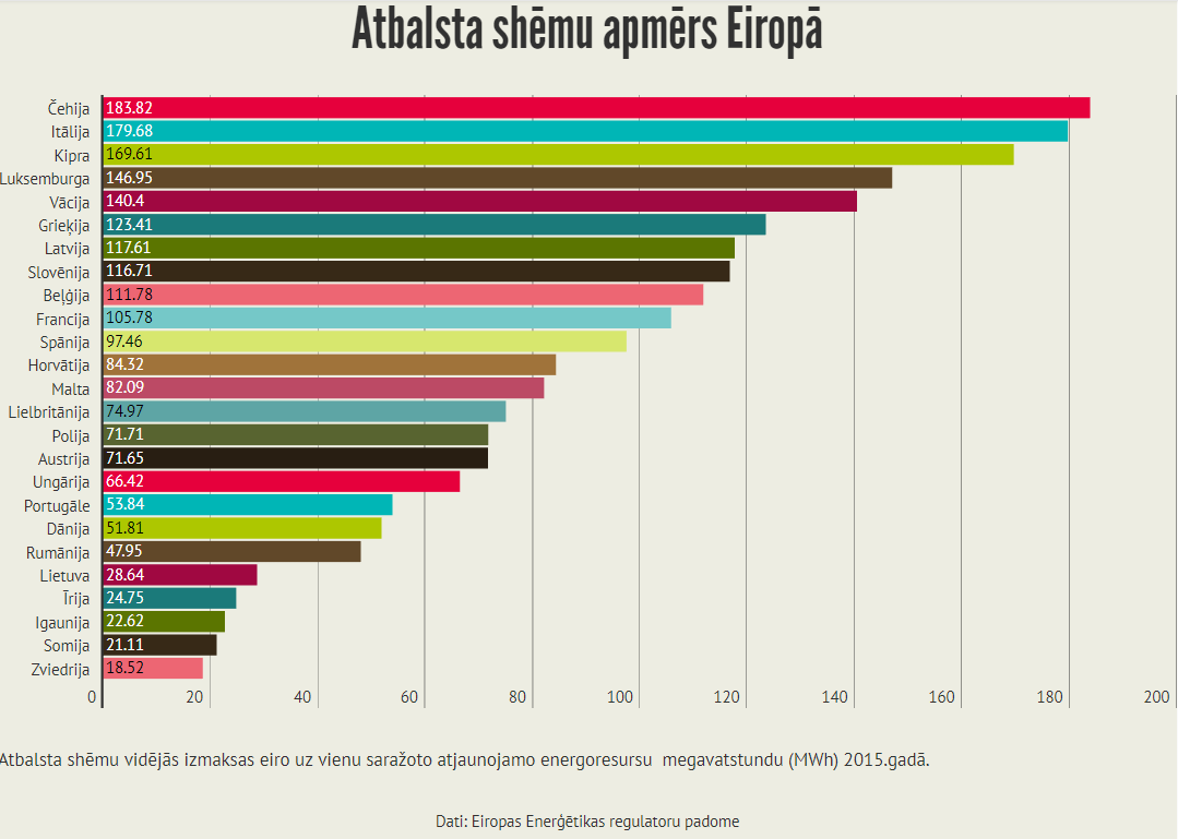 歐洲能源監(jiān)管委員會(huì)(CEER)去年完成了一項(xiàng)關(guān)于歐洲支持機(jī)制的重要研究。對2014年和2015年的數(shù)據(jù)進(jìn)行了分析,總體結(jié)論是:援助計(jì)劃為歐洲電力消費(fèi)者帶來巨大成本。歐洲綠色能源生產(chǎn)商在2015年收到的超過批發(fā)價(jià)格的平均成本為每兆瓦時(shí)110歐元(MWh)。最高的付款是在捷克共和國,意大利和塞浦路斯。在拉脫維亞,支付額也超過了歐洲的平均水平。反過來,最低溫室氣體補(bǔ)充劑在瑞典。